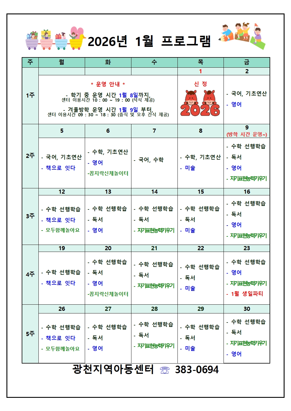 2026년 1월 월간 프로그램 및 식단표 안내